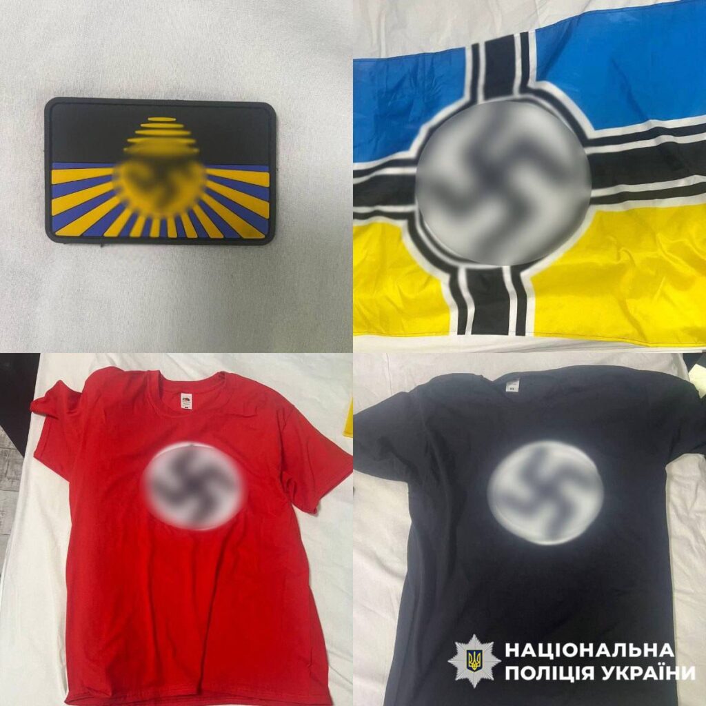 Під час обшуку за їх місцем мешкання в орендованій квартирі поліцейські вилучили речові докази – одяг, прапор та нарукавний шеврон з елементами символіки нацистського тоталітарного режиму.