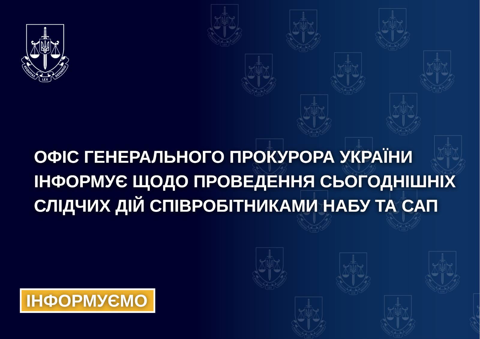 Офіс Генерального прокурора України поінформував щодо проведення сьогоднішніх слідчих дій співробітниками НАБУ та САП, передає Інше ТВ.