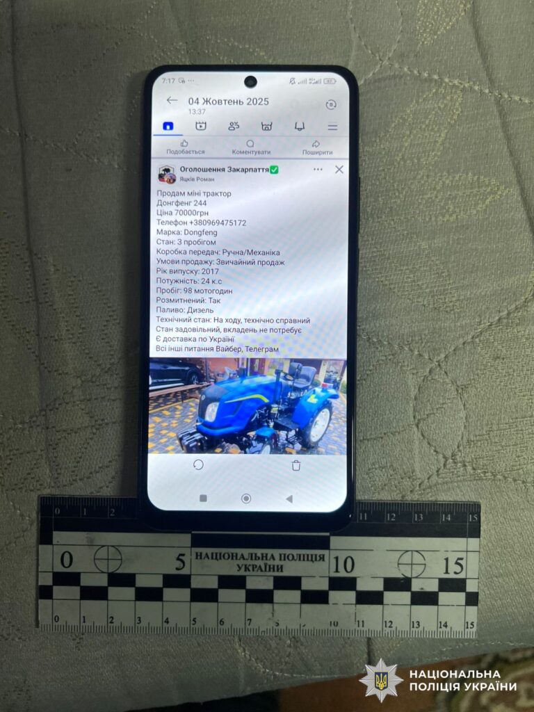 На майданчиках відомих маркетплейсів 26-річний чоловік, який відбуває покарання у місцях позбавлення волі, розміщував оголошення про продаж тракторів. У такий спосіб зловмисник привласнив майже 100 тисяч гривень довірливих покупців. Слідчі повідомили йому про підозру у скоєнні чотирьох таких фактів. Санкція статті передбачає до трьох років ув’язнення.