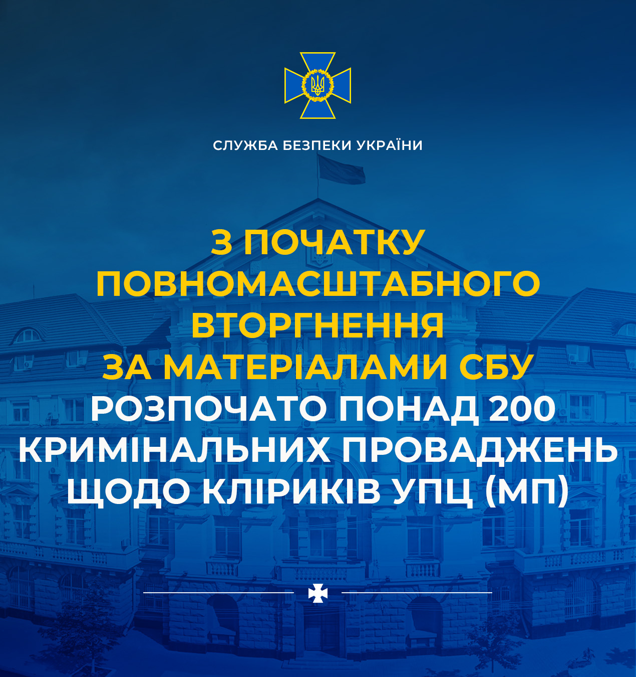З 2022 року за матеріалами Служби безпеки розпочато 208 кримінальних проваджень щодо антиукраїнської діяльності та інших злочинів з боку представників УПЦ (МП). Серед фігурантів – 27 вищих чинів церкви: митрополити та архієпископи, які підозрюються у роботі на рф.