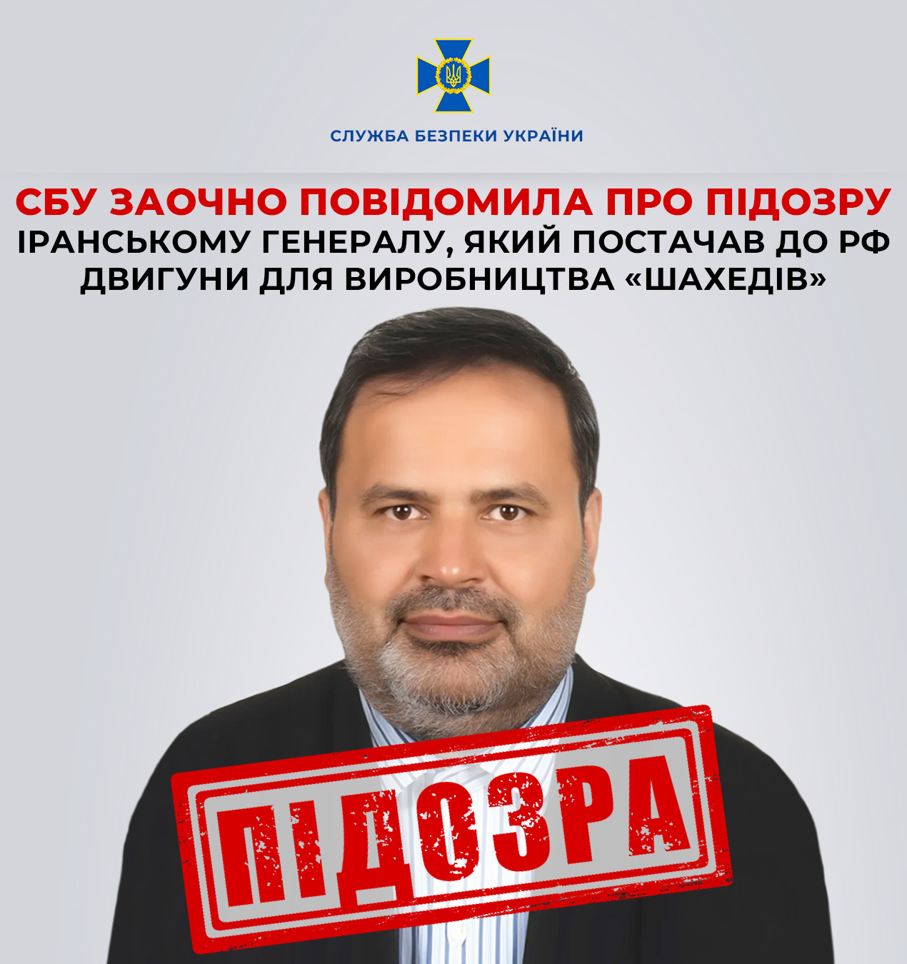 Служба безпеки та Нацполіція за процесуального керівництва ОГП зібрали докази воєнних злочинів з боку керівника Аерокосмічних сил Корпусу вартових ісламської революції бригадного генерала Абдолли Мехрабі.