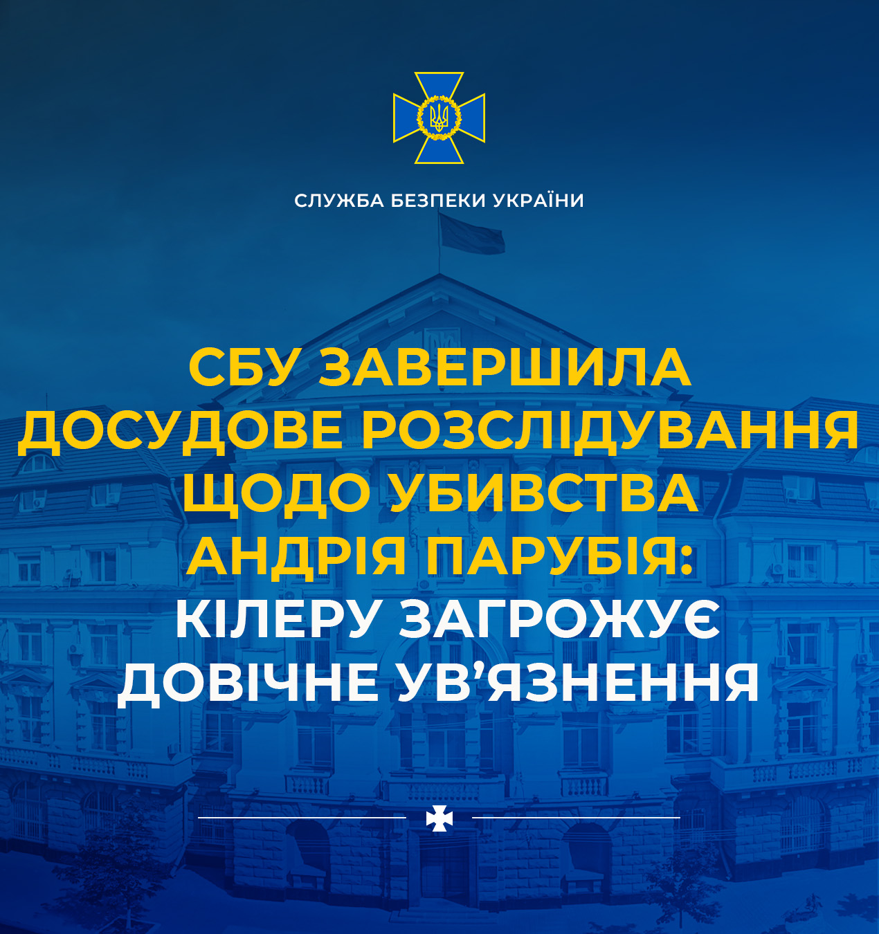 Служба безпеки завершила досудове розслідування та скерувала до суду обвинувальний акт на кілера, який підозрюється у вбивстві народного депутата України Андрія Парубія. Зловмиснику загрожує довічне ув’язнення з конфіскацією майна.