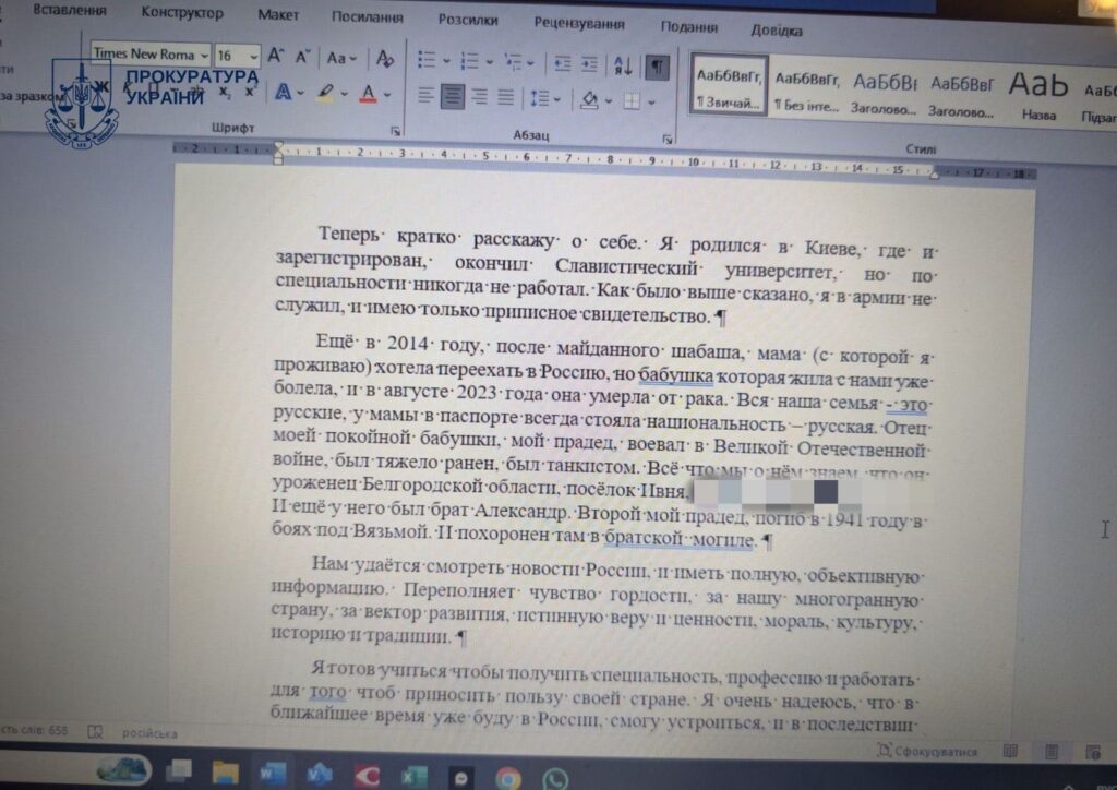 Експертизи підтвердили протиправні висловлювання підозрюваної. Крім того, під час обшуку вдома у підозрюваної виявлено листи до путіна та невідомих адресатів від імені сина жінки, в яких він просить допомогти йому виїхати з України, оскільки «не хоче жити серед нацистів» та бачить своє майбутнє в росії.