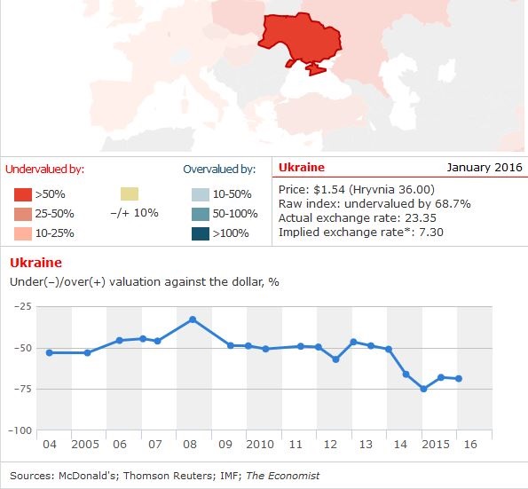 По оценкам экономистов, в Украине доллар должен стоить не 23,35 (взятый в расчет изданием курс), а всего 7,30 гривен. При этом Биг Мак стоит здесь $1,54 (36 гривен).