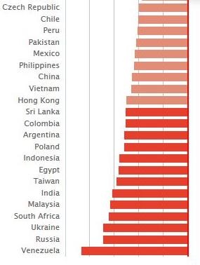 В России Биг Мак стоит 114 рублей, что означает недооценку российского рубля на 69%. Таким образом, курс доллара в России должен был бы составлять 23,12 рублей, а не 74,66 (взятый в расчет изданием курс).