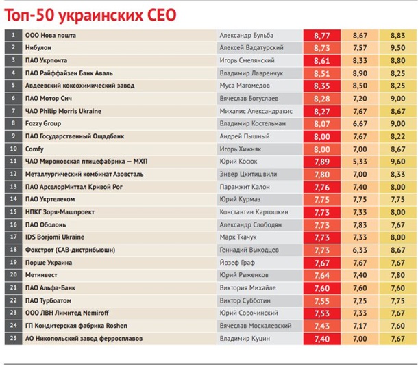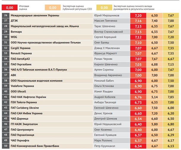 Мы опросили коллег-журналистов, а также известных аналитиков, задав им два вопроса — о публичной репутации руководителя компании и о вкладе руководителя в экономические результаты компании. Наверное, это слишком просто? Но у нас есть полная уверенность в том, что экономику двигают конкретные люди. Собственно, рейтинг и составлен на основании мнений более чем информированных лиц. Вот они: Алексей Янковой, Андрей Блинов, Даниил Монин, Елена Лысенко, Григорий Кукуруза, Павел Харламов, Александр Крамаренко, Виктория Страхова, Виктория Руденко, Борис Кушнирук. В следующий раз мы, конечно же, расширим перечень экспертов, потому что уверены: участвовать пожелают и те, до кого мы в этот раз по тем или иным причинам не достучались.