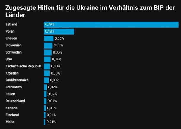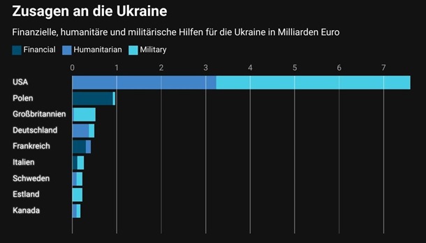 На первом месте по объему предоставленной помощи с большим отрывом оказались США, на втором – Польша, за ними следуют Великобритания и Германия, при этом на долю последней приходится гораздо больше гуманитарной помощи, чем военной, отмечается в статье.