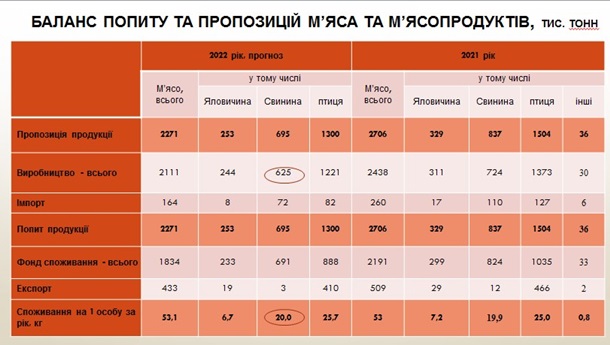 Прогноз пропозиції свинини – 695 тис. тонн, що на 13,7% менше, ніж торік, споживання на одну особу становитиме 20 кг на рік (у 2021 році було 19,9 кг).