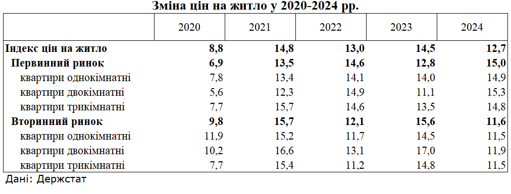 За даними статистичного відомства, ціни на квартири на первинному ринку за 2024 рік зросли на 15,0%, на вторинному – на 11,6%.
