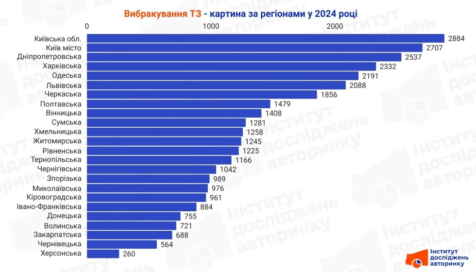 Обсяги звернень за вибракуванням ТЗ за регіонами корелюється з активністю авторинку та локальним насиченням парку транспортом. Найбільше на вибракування було подано заяв у Київській області — 2 884. Друге місце у цьому заліку посіла столиця з підсумком 2 707 списаних назавжди ТЗ. Третій результат показали автомобілісти Дніпропетровської області, які здали номери 2 537 машин.