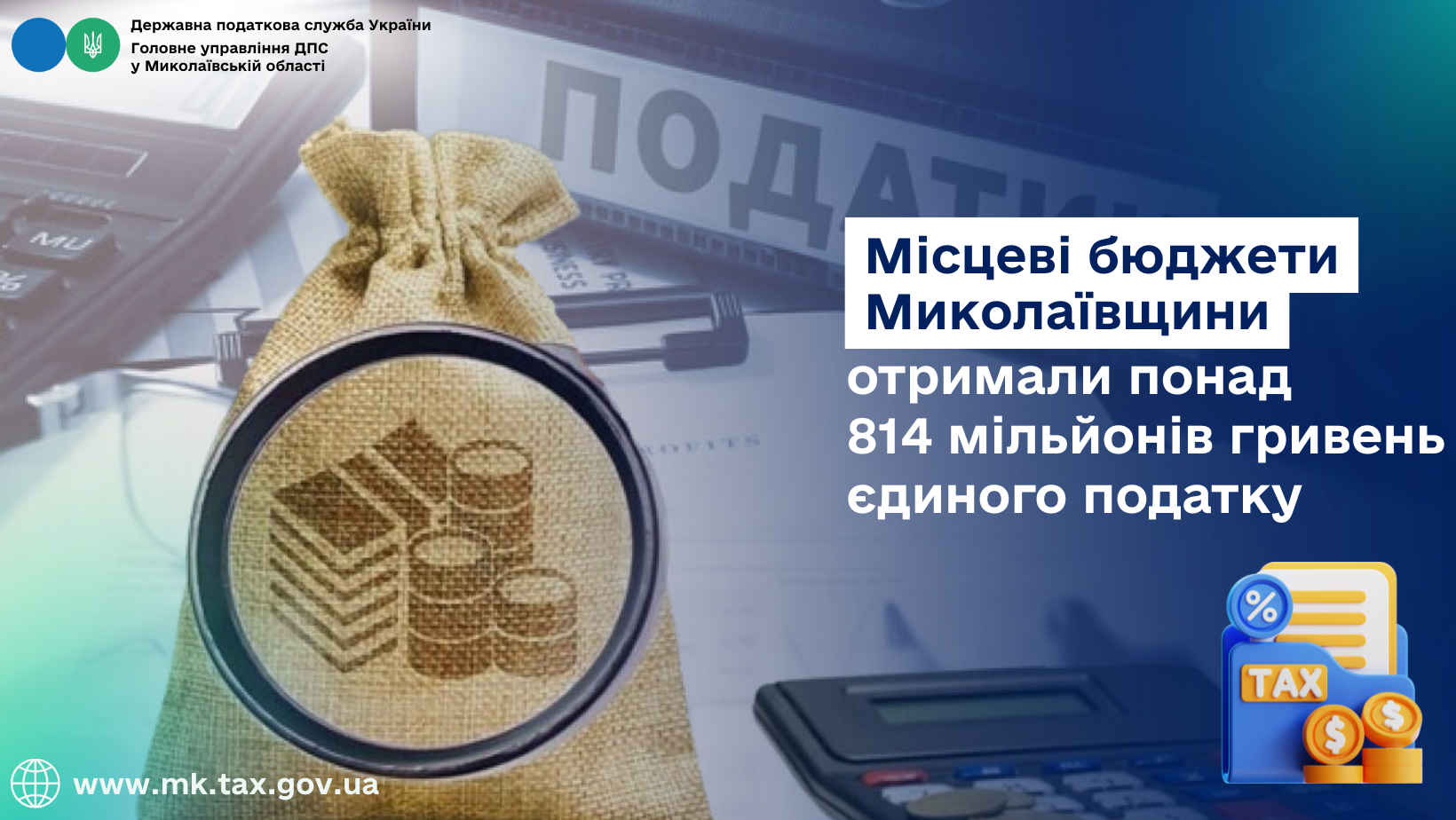 У січні – квітні 2025 року до місцевих бюджетів Миколаївщини забезпечено 814,2 млн грн єдиного податку, що на 24 відс., або на 157,7 млн грн більше, ніж за аналогічний період 2024 року.