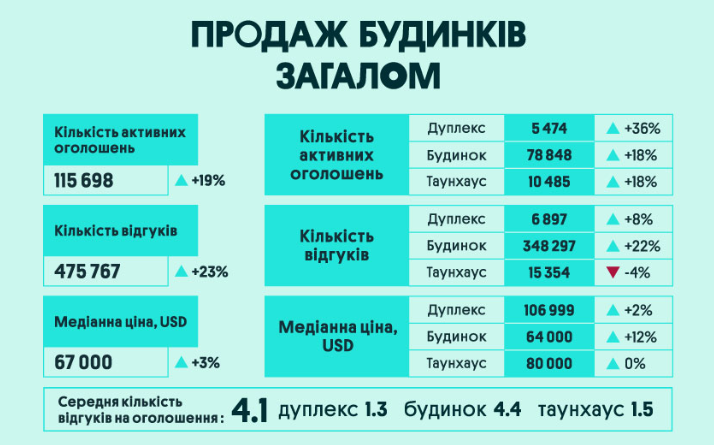 Сегмент оренди будинків також став активнішим: кількість відгуків збільшилась на 38%, пропозицій — на 10%, а медіанна ціна зросла на 64%. Найбільше подорожчала оренда в Миколаєві (+50%) та Одесі (+45%), тоді як у Хмельницькому ціни впали на 50%, а в Івано-Франківську — на 25%, свідчать дані Olx.