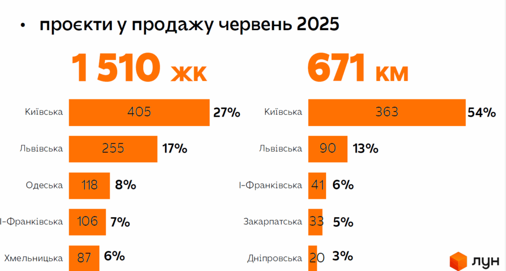 Водночас, за даними ЛУН Статистика, сьогодні в Україні у продажу 671 котеджне містечко. Левова частка проєктів припадає на Київську область – 54% (363), ще 13% у Львові (90) та Івано-Франківську – 6% (41).