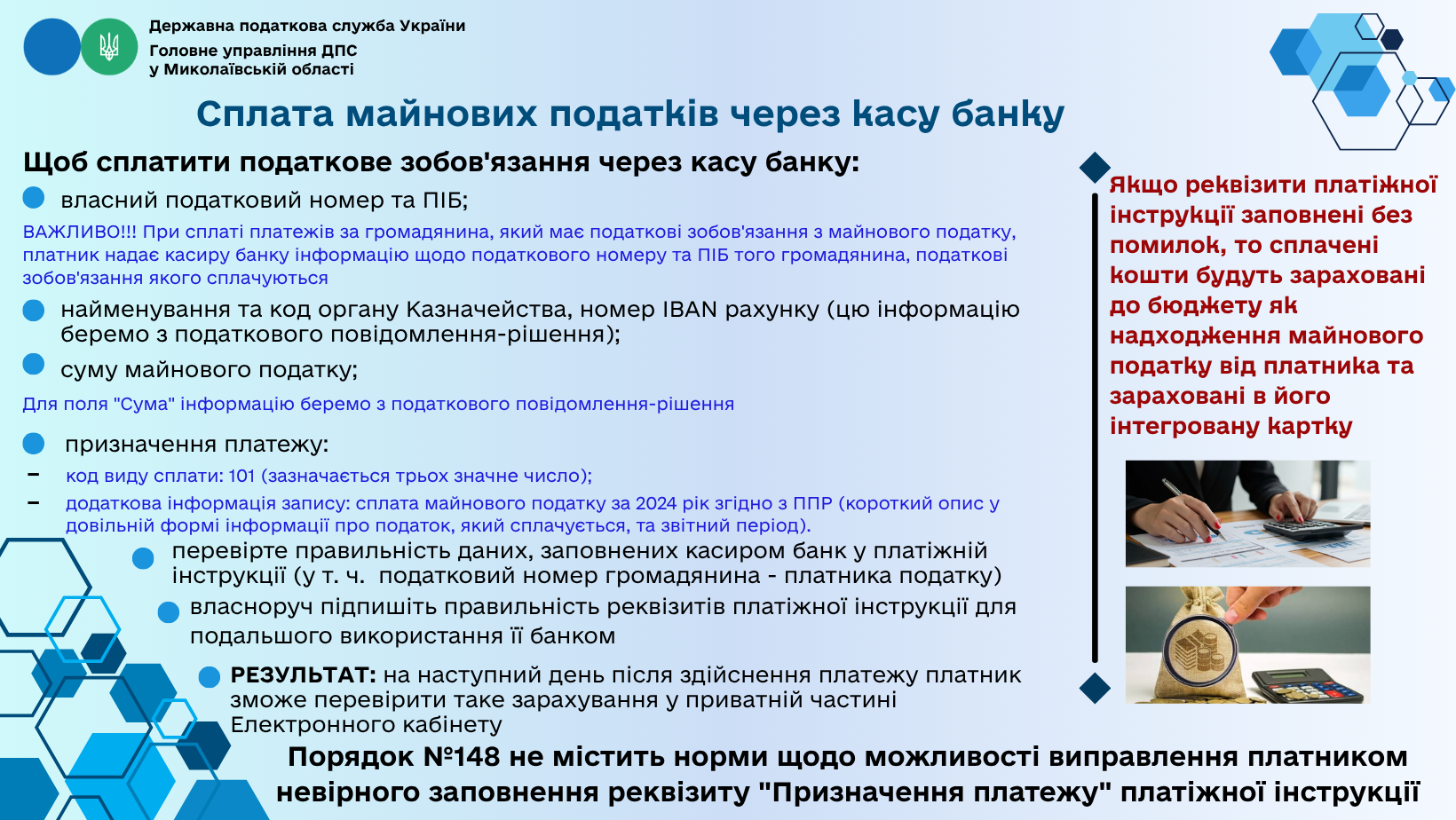 Головне управління ДПС у Миколаївській області пропонує до уваги платників податків детальну інструкцію щодо сплати податкових зобов’язань з майнових податків, зокрема земельного податку, у касі банківських установ.