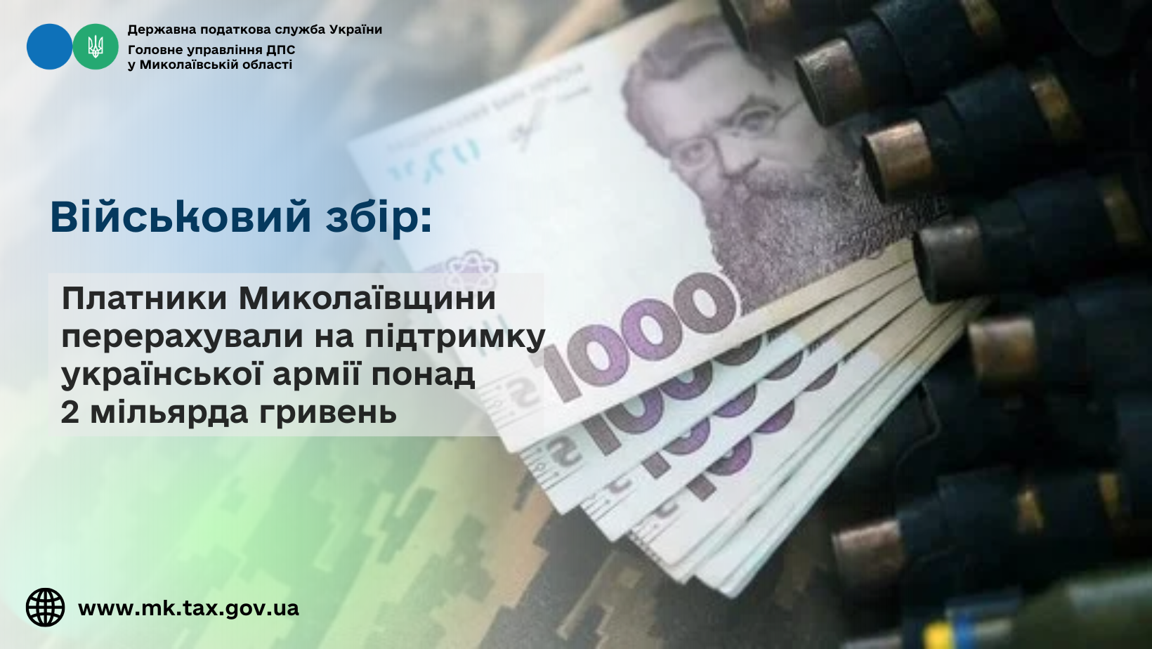 Очільник податкової служби Миколаївщини зазначив, що платники податків Миколаївщини активно підтримують Збройні Сили України, сумлінно та прозоро сплачуючи військовий збір. А стабільне надходження до бюджету військового збору свідчить про ефективність вжитих заходів з детінізації доходів, зокрема, щодо легалізації заробітної плати, а також про відповідальність та патріотизм платників податків, які сумлінно виконують свій конституційний обов’язок щодо сплати податків до бюджету, у т.ч. і військового збору.