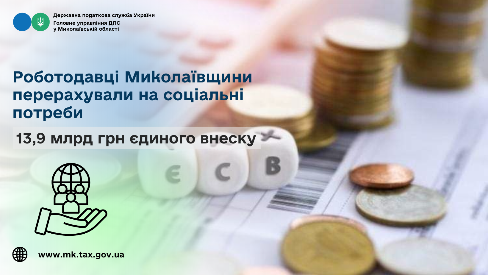 У січні – жовтні 2025 року платники податків Миколаївщини перерахували до пенсійного та соціальних фондів України 13,9 млрд грн єдиного внеску на загальнообов’язкове державне соціальне страхування (далі – єдиний внесок), що на 19,1 відс., або на 2,2 млрд грн більше, ніж у аналогічному періоді 2024 року.