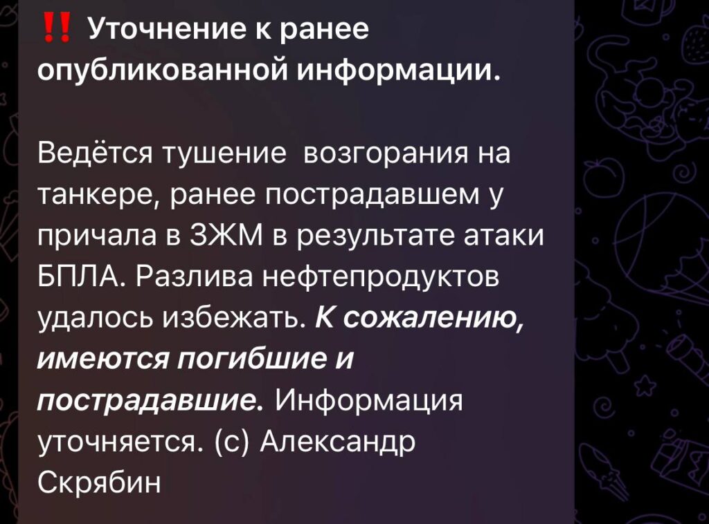 У порту Ростова-на-Дону під ударом опинився термінал перевалки нафти та нафтоналивний танкер Валерій Горчаков (Valery Gorchakov). Повідомляється, що два члени екіпажу загинули, ще троє – отримали поранення.