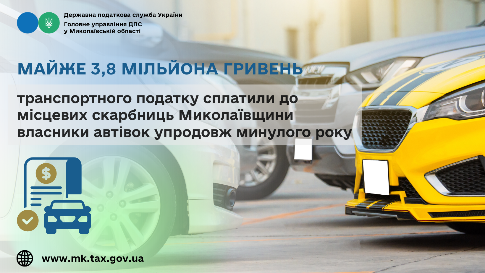 У січні – грудні 2025 року до місцевих бюджетів Миколаївщини забезпечено 3,8 мільйона гривень транспортного податку, що на 355 тис. грн більше, ніж за 12 місяців 2024 року.