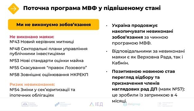 «Нова програма МВФ перебуває в підвішеному стані через невиконання ключових зобов’язань з боку парламенту та уряду. Прогресу за попередніми заходами (Prior Actions) для нової програми немає. Це закриває доступ до $8,2 млрд від МВФ і може загальмувати близько 90 млрд євро (понад $106 млрд) від ЄС», – йдеться у повідомленні RRR4U.