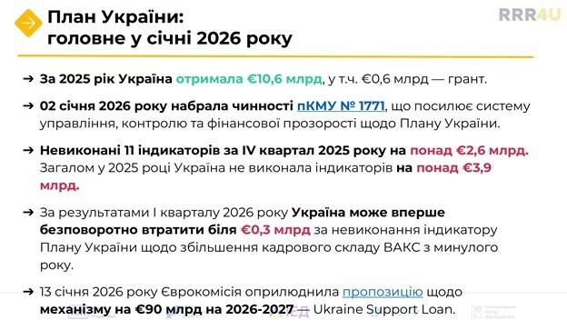 Як уточнюють експерти RRR4U, протягом січня Україна теж не виконала жодного індикатора за Ukraine Facility (їх загалом сім на перший квартал 2026 року). Більше того, якщо до кінця березня не буде вирішено питання зі збільшенням складу ВАКС, з виплатою у розмірі $300 млн за цим індикатором можна взагалі розпрощатись.