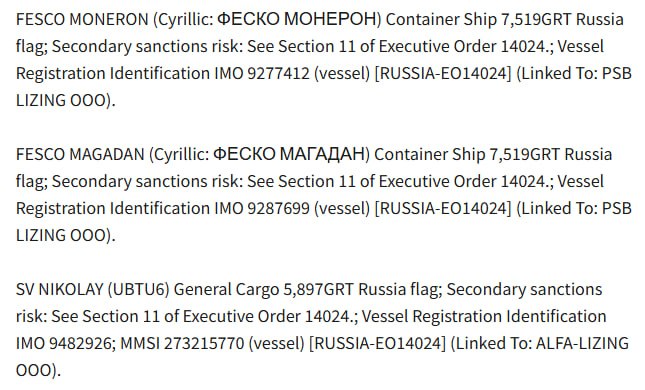 Як повідомляє сайт американського Мінфіну, йдеться про контейнеровози Fesco Moneron, Fesco Magadan та вантажне судно Sv.Nikolay.