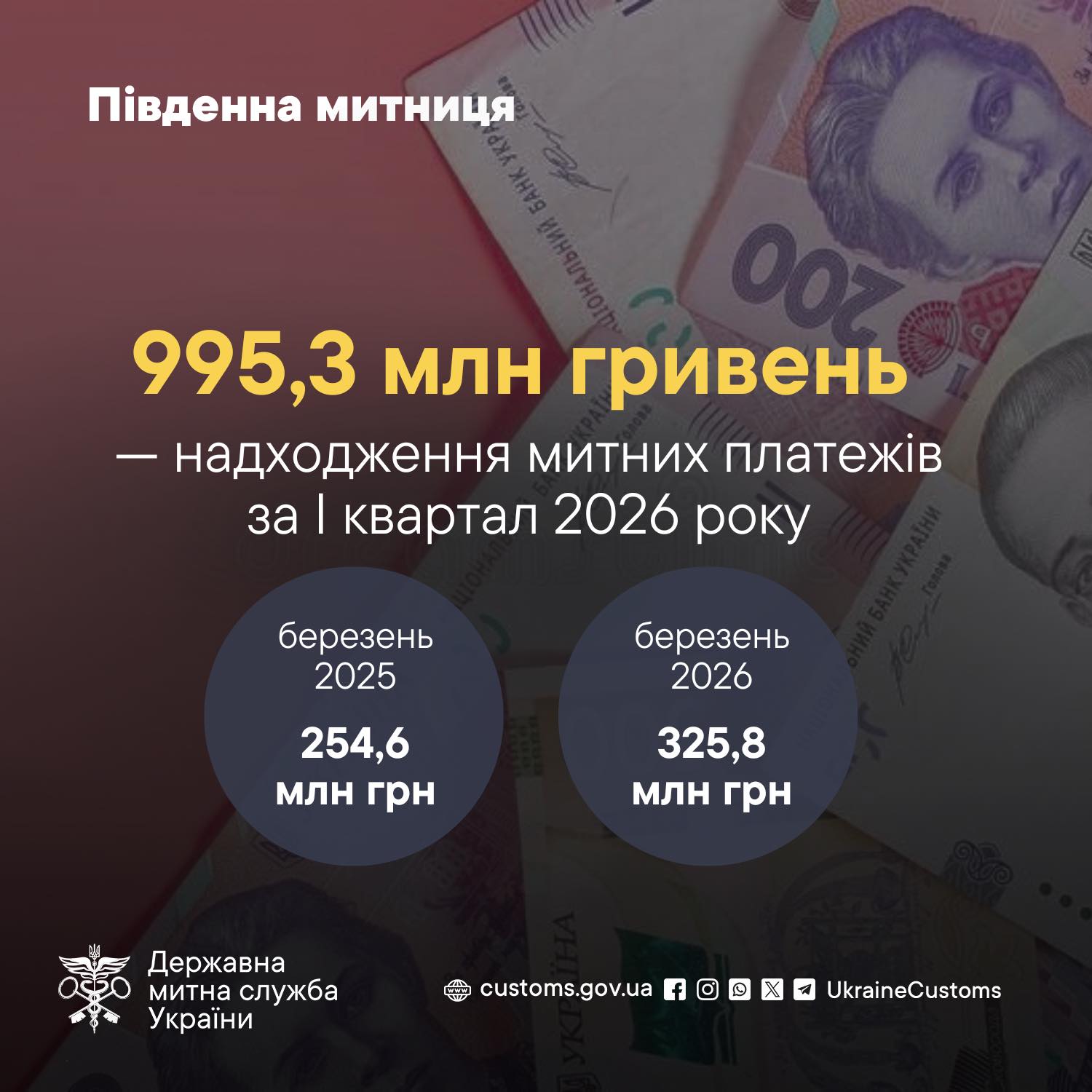 Як зазначається, за підсумками роботи у березні 2026 року Південна митниця забезпечила надходження до Державного бюджету України в обсязі 325,8 млн грн митних платежів, що становить 115,8% індикативного показника доходів за вказаний місяць.