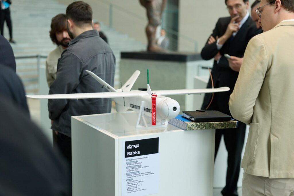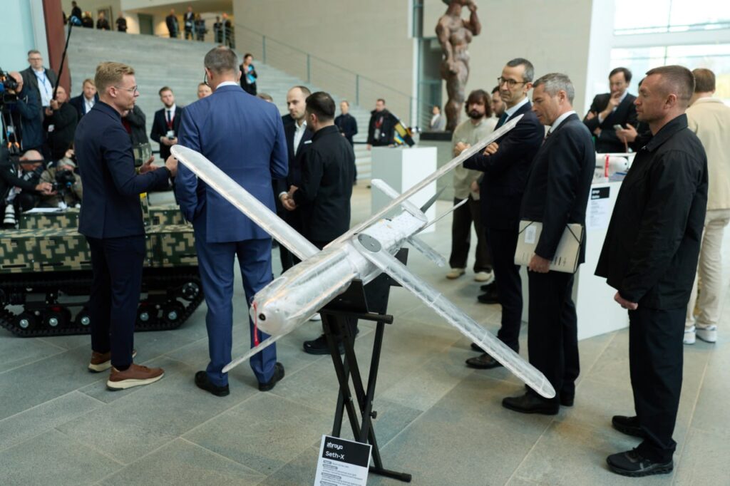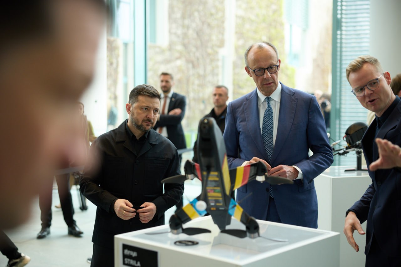 У Берліні перед початком двосторонньої зустрічі Президенту України Володимиру Зеленському та Федеральному канцлеру Німеччини Фрідріху Мерцу продемонстрували сім видів дронів, виготовлених на українських підприємствах.