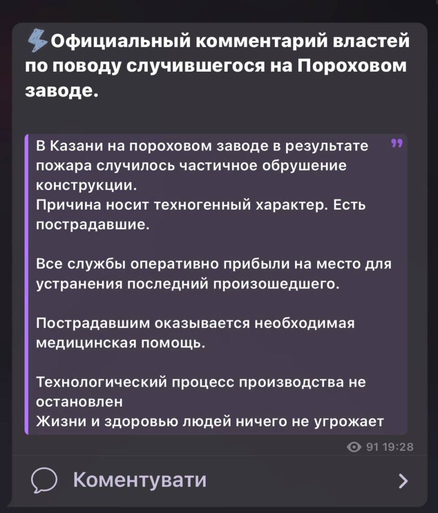 Сьогодні у Казані пролунали вибухи на пороховому заводі.