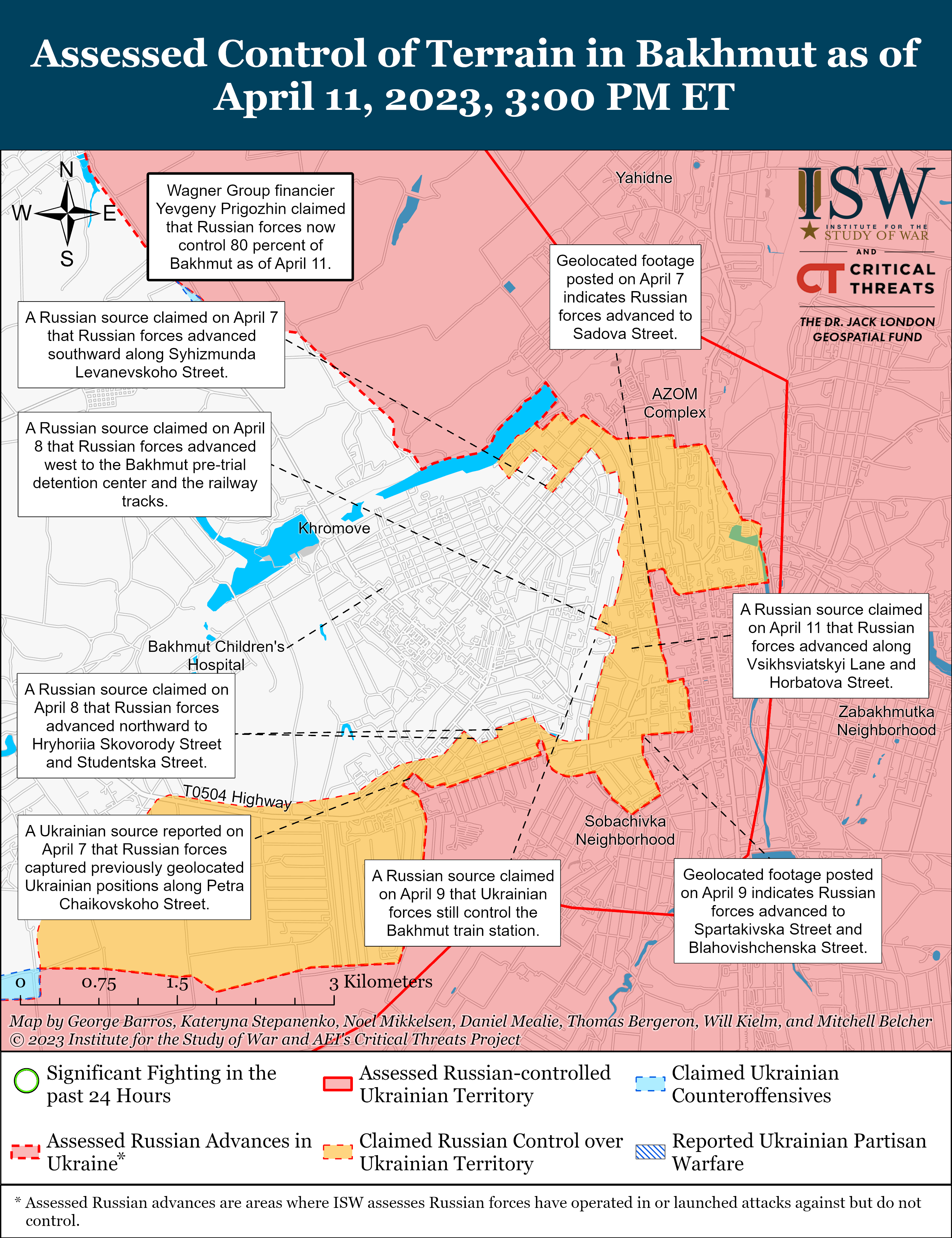 11 квітня російські війська продовжували атакувати Бахмут і його околиці. Генштаб України повідомив, що російські війська здійснили невдалі наземні удари по Бахмуту, а також поблизу Хромового (2 км на захід від Бахмута), Богданівки (6 км на північний захід від Бахмута) і Григорівки. (8 км на північний захід від Бахмута). Деякі російські міліблогери стверджували, що російські війська поступово просуваються в районі Оріхово-Василівки (11 км на північний захід від Бахмута) і Богданівки, а також біля залізничної станції в центрі Бахмута, але інший заперечував будь-які успіхи Росії на північний захід від Бахмута. Один мілблогер стверджував, що візит глави Донецької народної республіки (ДНР) Дениса Пушиліна 10 квітня до Бахмута свідчить про те, що українські сили втрачають більше позицій у Бахмуті, але точне місцезнаходження Пушиліна залишається невідомим.