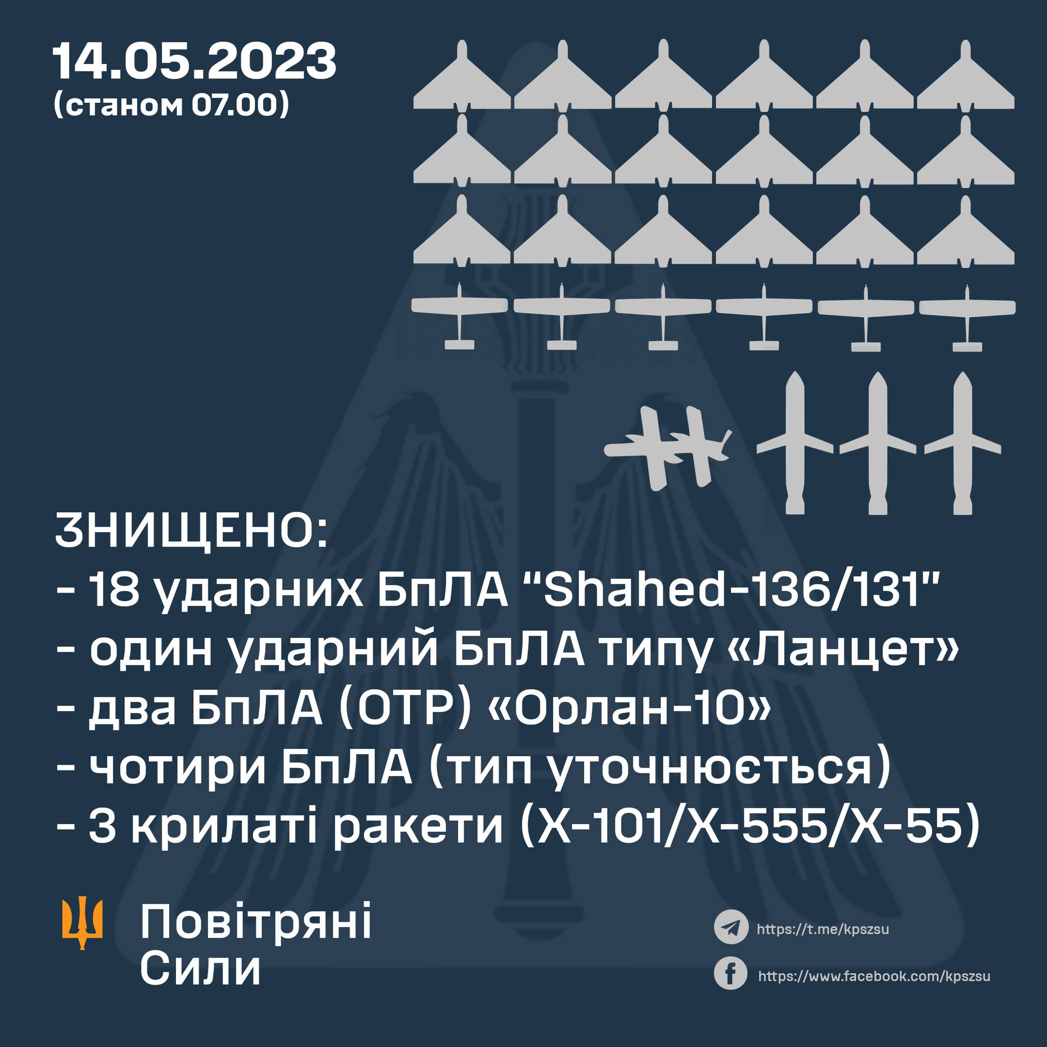 У ніч на 14 травня 2023 року російські окупанти атакували Україну з різних напрямків ударними дронами «Shahed-136/131», ракетами «Калібр» з кораблів у Чорному морі, крилатими ракетами Х-101/Х-555/Х-55 з літаків стратегічної авіації Ту-95мс.