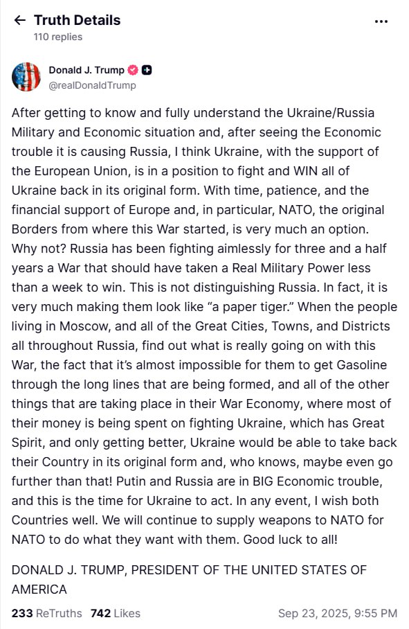 Путін і Росія сьогодні у ВЕЛИЧЕЗНИХ економічних труднощах, і саме зараз для України час діяти. У будь-якому випадку я бажаю обом країнам добра. Ми й надалі будемо постачати зброю НАТО, а Альянс зможе розпорядитися нею на власний розсуд. Успіхів усім!
