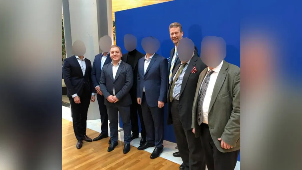 Колишній член українського парламенту Олег Волошин (третій зліва) контактував із Нейтаном Гіллом. США, які ввели проти нього санкції у 2022 році за президентства Джо Байдена перед повномасштабним вторгненням в Україну, заявили, що він співпрацював із «російськими акторами для підриву діяльності українських чиновників і виступав на користь Росії».