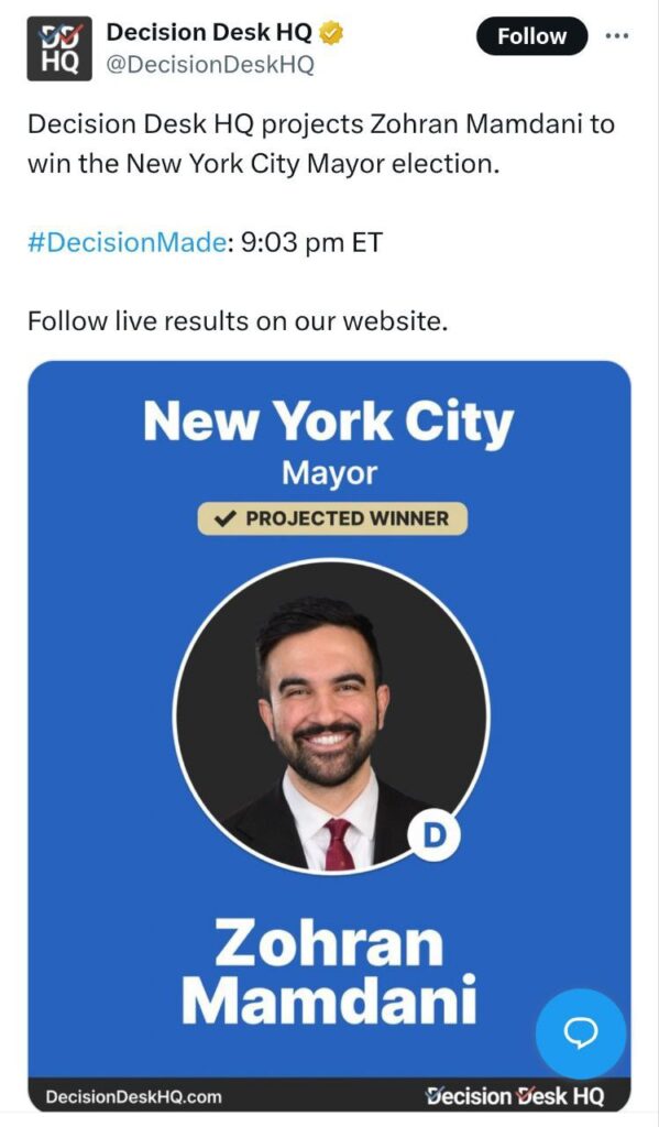 Головною новиною середи є перемога демократа Зохрана Мамдані на виборах мера Нью-Йорка. Політик, який виступає за підвищення податків для найбагатших представників бізнесу, пропонує реформу правоохоронної системи міста та просуває різноманітні соціальні програми для населення неодноразово зазнавав критики з боку “трампістів”, однак це не завадило йому перемогти Ендрю Куомо (демократ, колишній губернатор штату) та республіканця Кертіса Сліву.