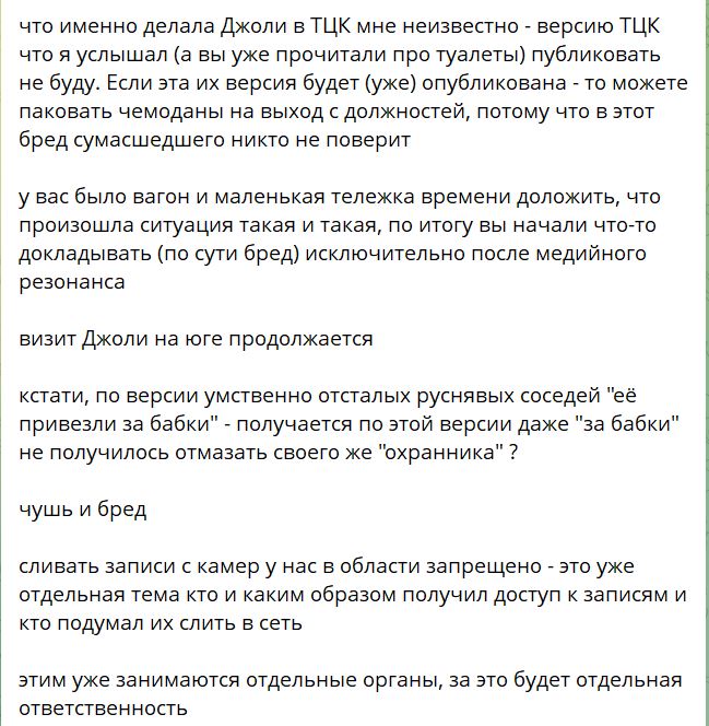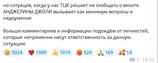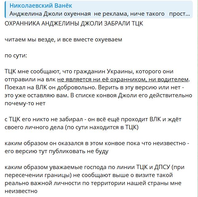 «З Анджеліною Джолі все нормально, вона дійсно відвідала ТЦК та СП. Заїхала та попросилася до вбиральні. Щодо її охоронця — це офіцер запасу. Силоміць його ніхто не затримував. Його запросили відвідати ТЦК та СП. Встановили його особу, після чого він спокійно поїхав по своїх справах. Проблемних питань не виникало. Все в рамках закону», — повідомило для ТСН.ua високопоставлене джерело в командуванні Сухопутних військ ЗСУ.