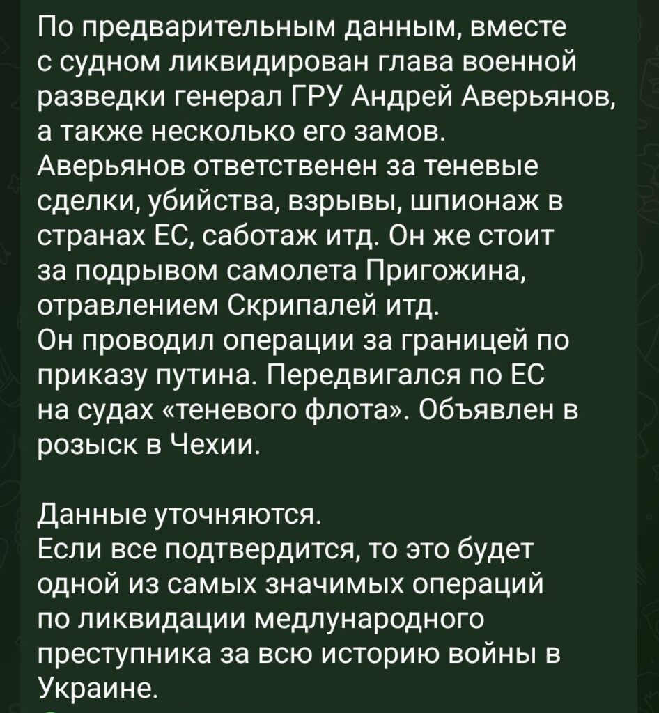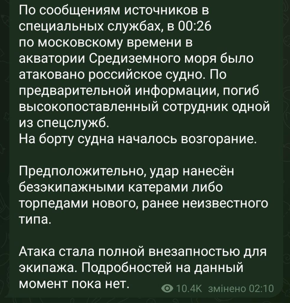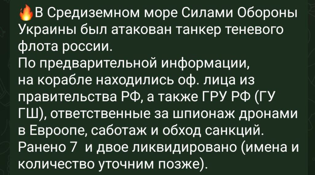 Однак, пабліки пишуть, що це була атака з подвійним дном – нібито на борту танкера був чи не головний ГРУшник РФ.