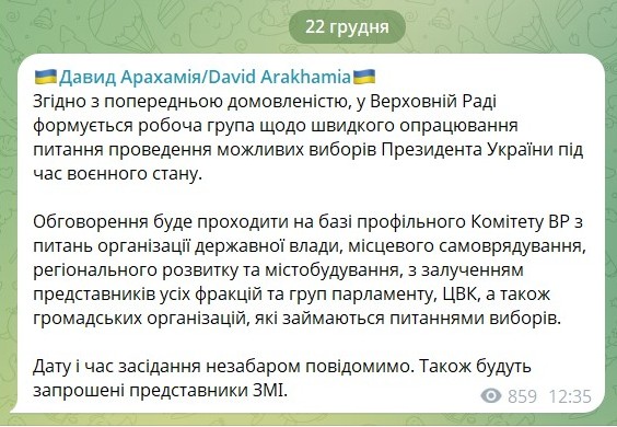 Про це повідомив керівник парламентської фракції «Слуга народу» Давид Арахамія, зазначивши, що формування такої робочої групи проходить «згідно з попередньою домовленістю», передає Інше ТВ.
