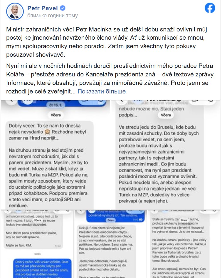 Президент Чехії Петр Павел заявив, що міністр закордонних справ Петр Мацінка його шантажує, і закликав компетентні органи дати оцінку діям урядовця.