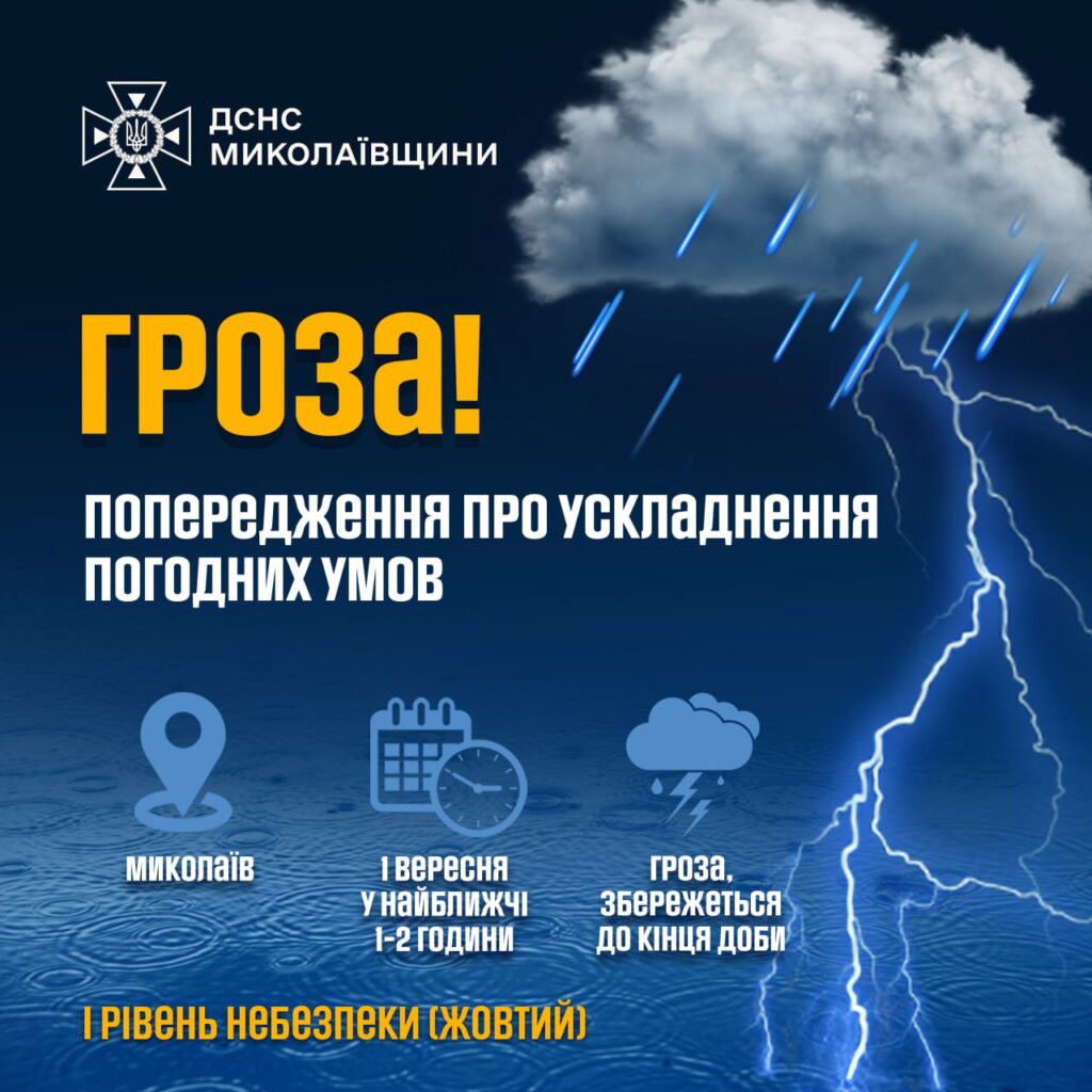 Від Миколаївського обласного гідрометцентру надійшло повідомлення про штормове попередження, найближчі 1-2 години по місту очікується гроза. Збережеться до кінця доби. І рівень небезпечності – жовтий.