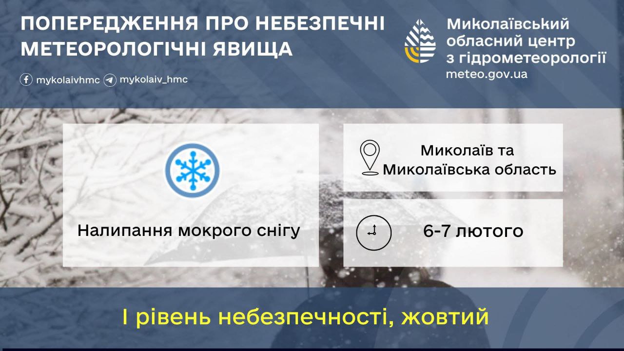 6-7 лютого 2026 року по Миколаївській області очікується налипання мокрого снігу.