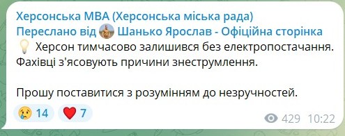 «Херсон тимчасово залишився без електропостачання. Фахівці з’ясовують причини знеструмлення. Прошу поставитися з розумінням до незручностей», – просить Ярослав Шанько.