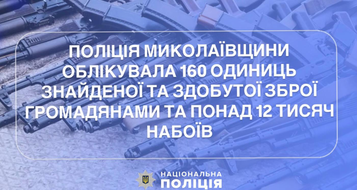 Як повідомили в поліції Миколаївщини, станом на 6 лютого за зверненнями громадян поліцейські зареєстрували в установленому порядку 160 одиниць зброї, серед якої: 94 автомати, 13 карабінів, 13 пістолетів та 40 одиниць гладкоствольної. Крім того, мешканці задекларували понад 12 тисяч набоїв різного калібру.