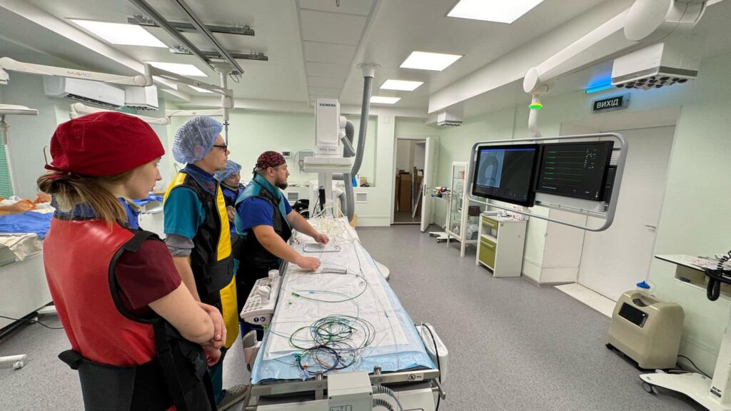 Минулого тижня на базі відділення відбулося перше навчання нейроінтервенційної команди лікарів. Фахівці працювали з комп’ютерною симуляцією клінічних випадків «Mentice» та «full body flow model», що дало змогу відпрацювати техніку ендоваскулярних втручань під контролем ангіографа.
