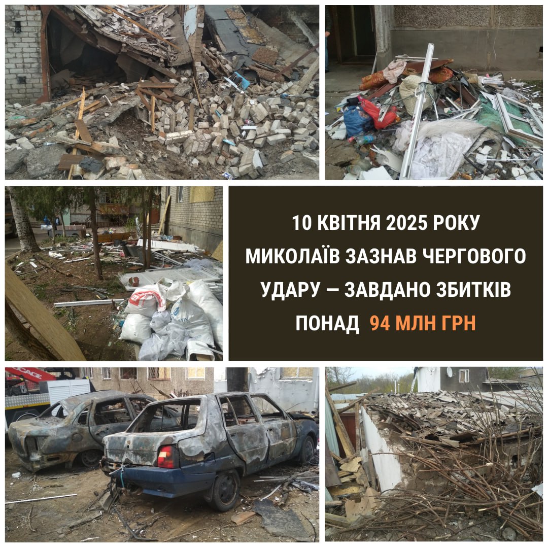 10 квітня 2025 року внаслідок влучань БпЛА території Миколаєва було пошкоджено багатоповерхові житлові будинки, адміністративні споруди та гаражі.