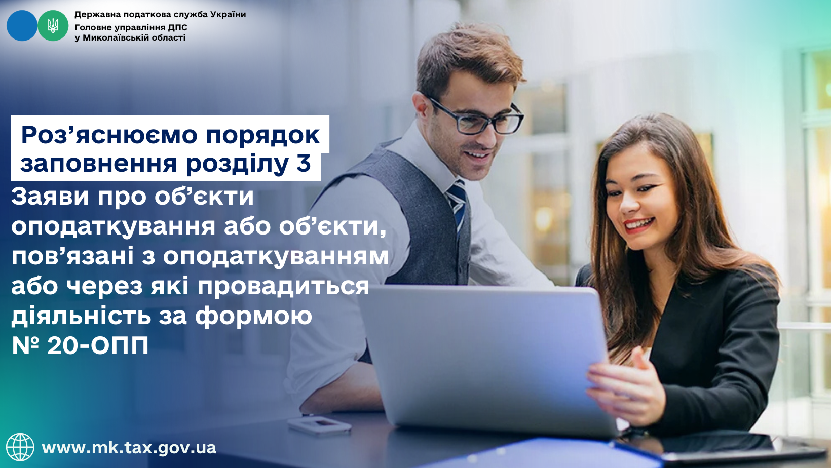 Головне управління ДПС у Миколаївській області повідомляє, що згідно з п. 8.1 розд. VIIІ Порядку обліку платників податків і зборів, затвердженого наказом Міністерства фінансів України від 09.12.2011 № 1588 із змінами і доповненнями (далі – Порядок № 1588), платник податків зобов’язаний повідомляти про усі об’єкти оподаткування і об’єкти, пов’язані з оподаткуванням, контролюючий орган за основним місцем обліку шляхом подання заяви про об’єкти оподаткування або об’єкти, пов’язані з оподаткуванням або через які провадиться діяльність за ф. № 20-ОПП (далі – Заява за ф. № 20-ОПП) (додаток 10 до Порядку № 1588) у порядку, встановленому розд. VIIІ Порядку № 1588.