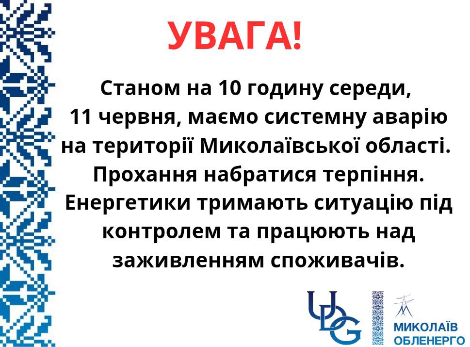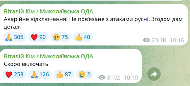 Голова Миколаївської ОВА Віталій Кім повідомив, що аварійне вимкнення не пов’язане з війною, і запевнив, що вимкнення не триватиме довго.