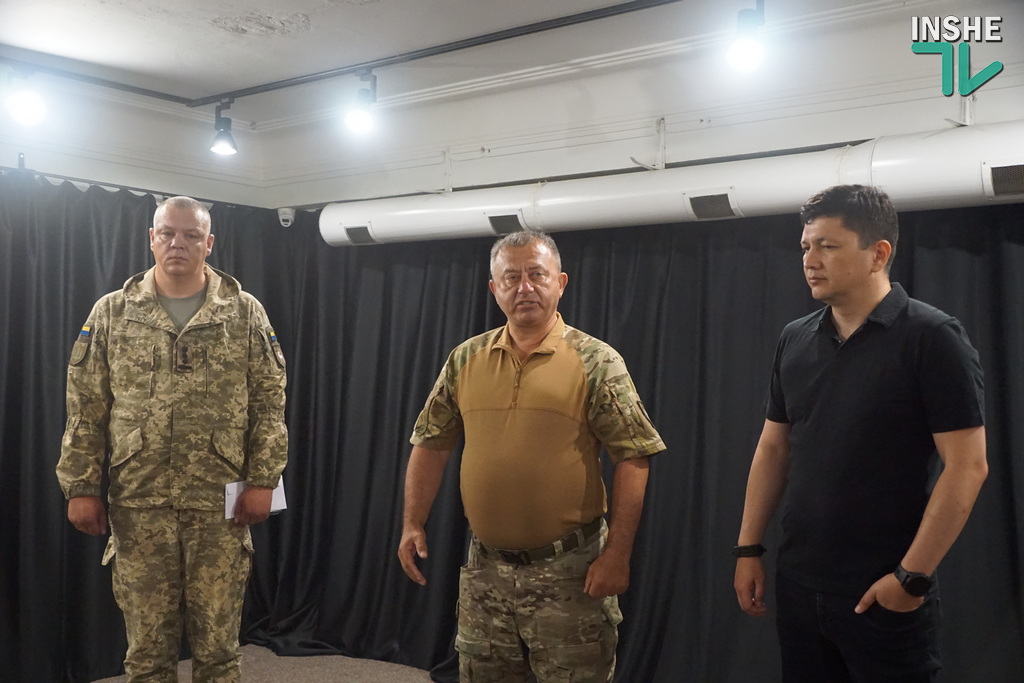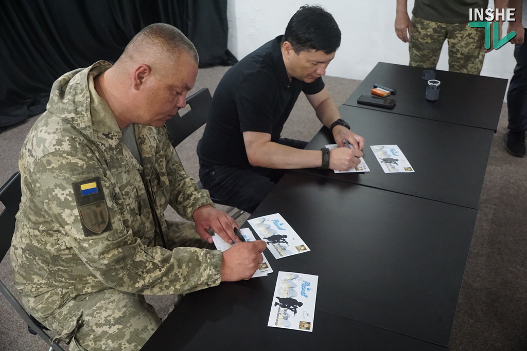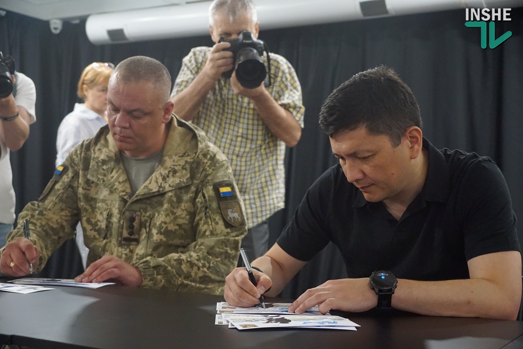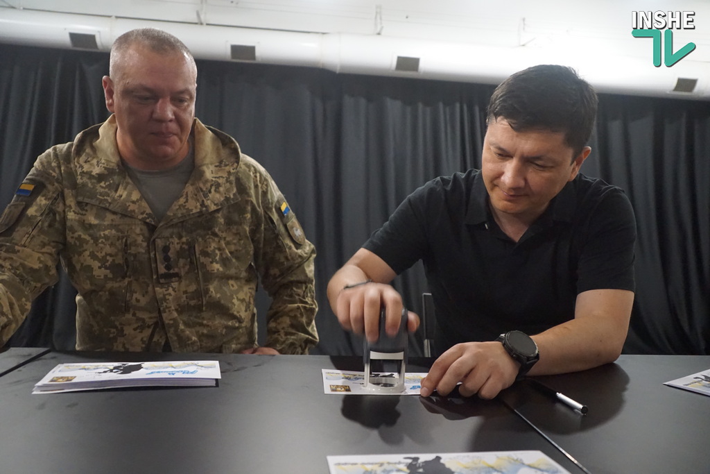 Спочатку командир 123-ї бригади ТрО ЗСУ Олег Макуха та начальник Миколаївської ОВА Віталій Кім провели церемонію спецпогашення нової марки, присвяченої 7-й річниці створення 123-ї бригади ТрО ЗСУ.
