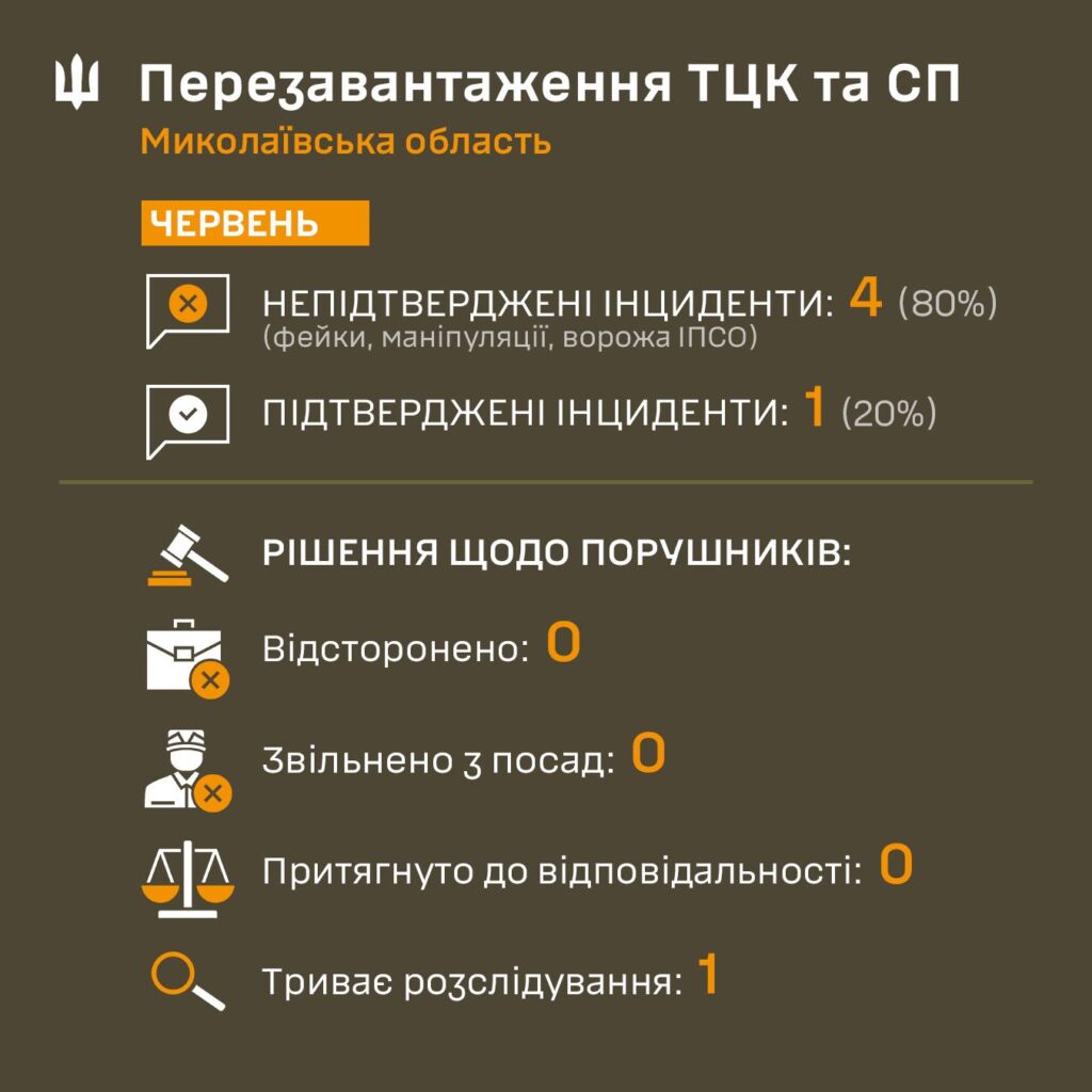 Згідно з даними Миколаївського обласного ТЦК та СП, за червень на Миколаївщині зареєстровано 5 інцидентів з ТЦК, з яких тільки один підтверджений.