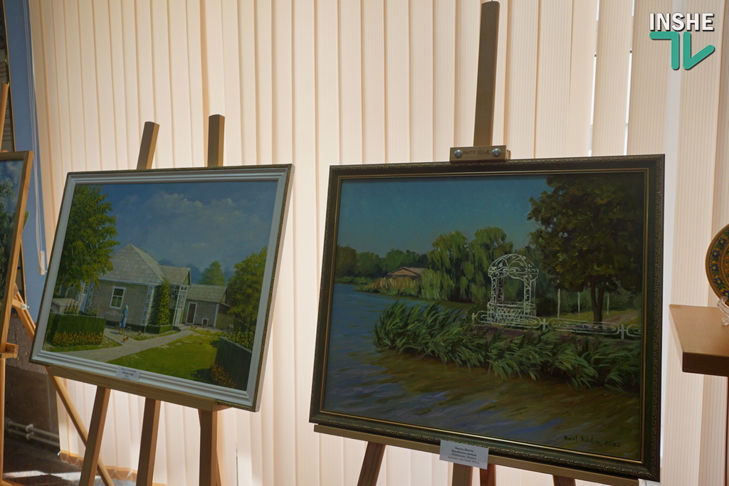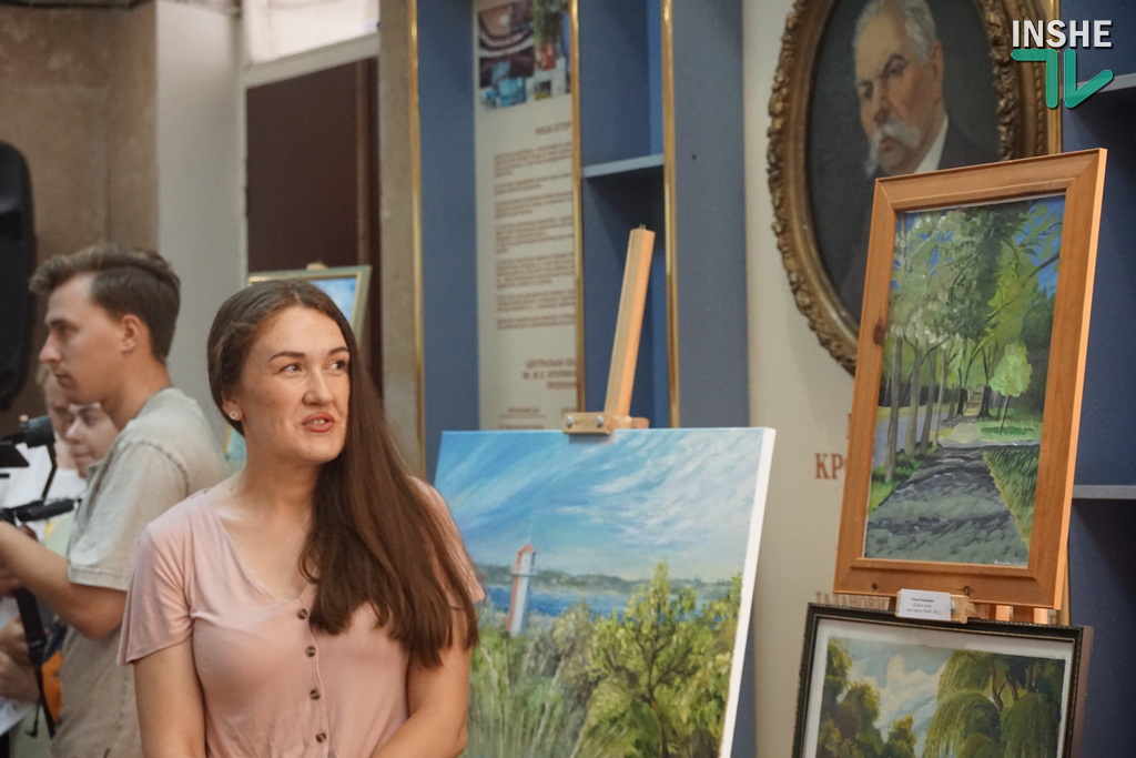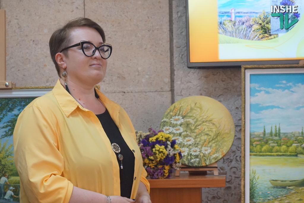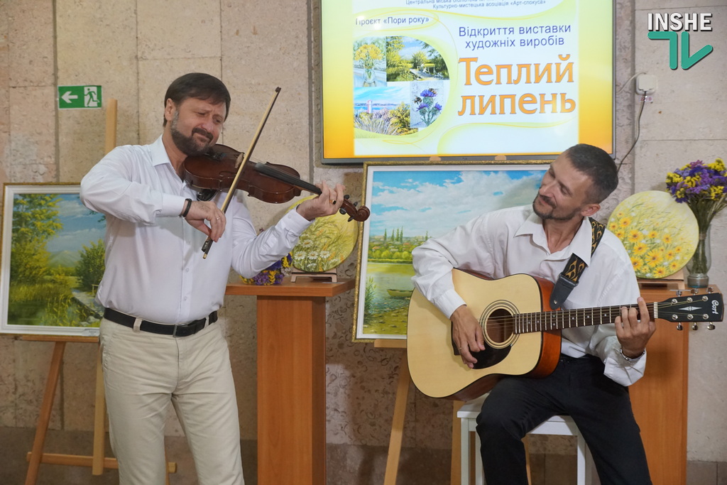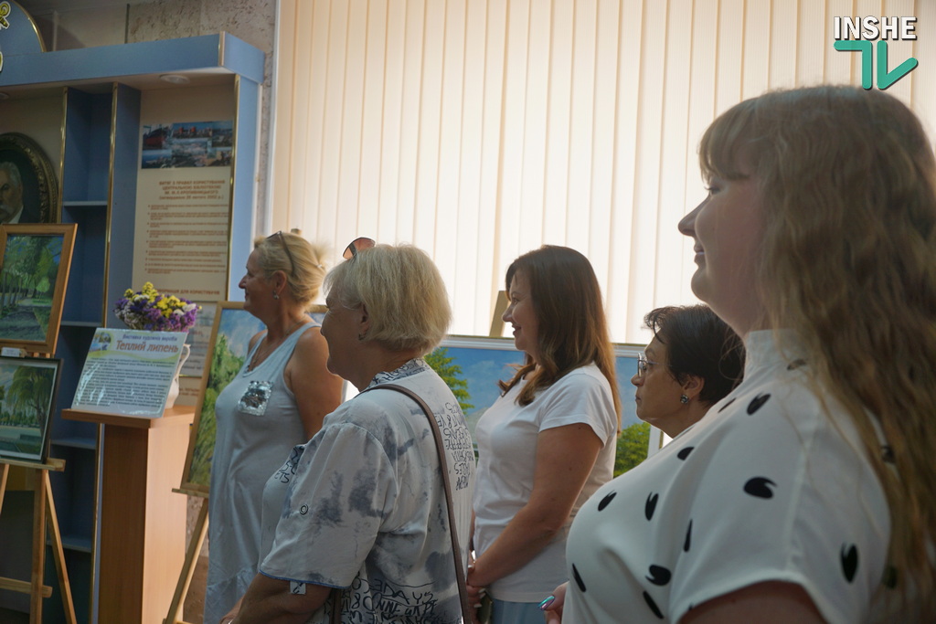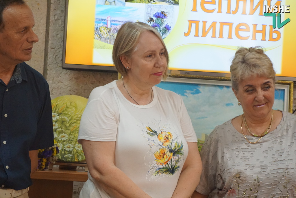 Керівниця Культурно-мистецької асоціації «Арт-спокуса» Валентина Кривцова звернула увагу на палітру робіт, в який переважає зелений, жовтий і блакить, коли дерева і вода дарують таку бажану у липні прохолоду від сонячних променів, оскільки липень вважається найтеплішим місяцем року.