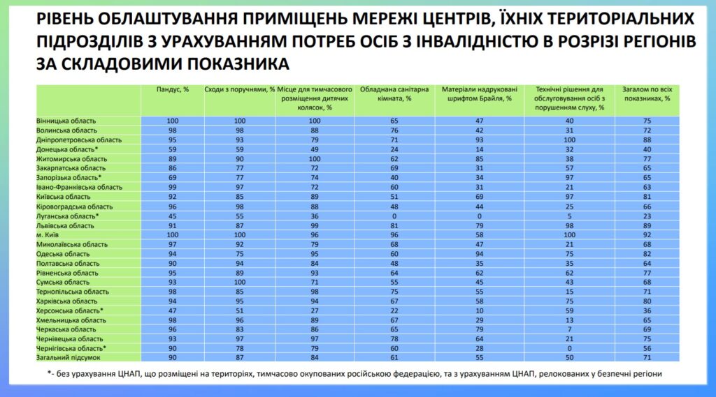 Миколаївщина розділила умовне 12 місце з Сумською областю. Найгірша в ЦНАПах Миколаївської області ситуація з технічними рішеннями для обслуговування осіб з порушеннями слуху та матеріалами шрифтом Брайля.