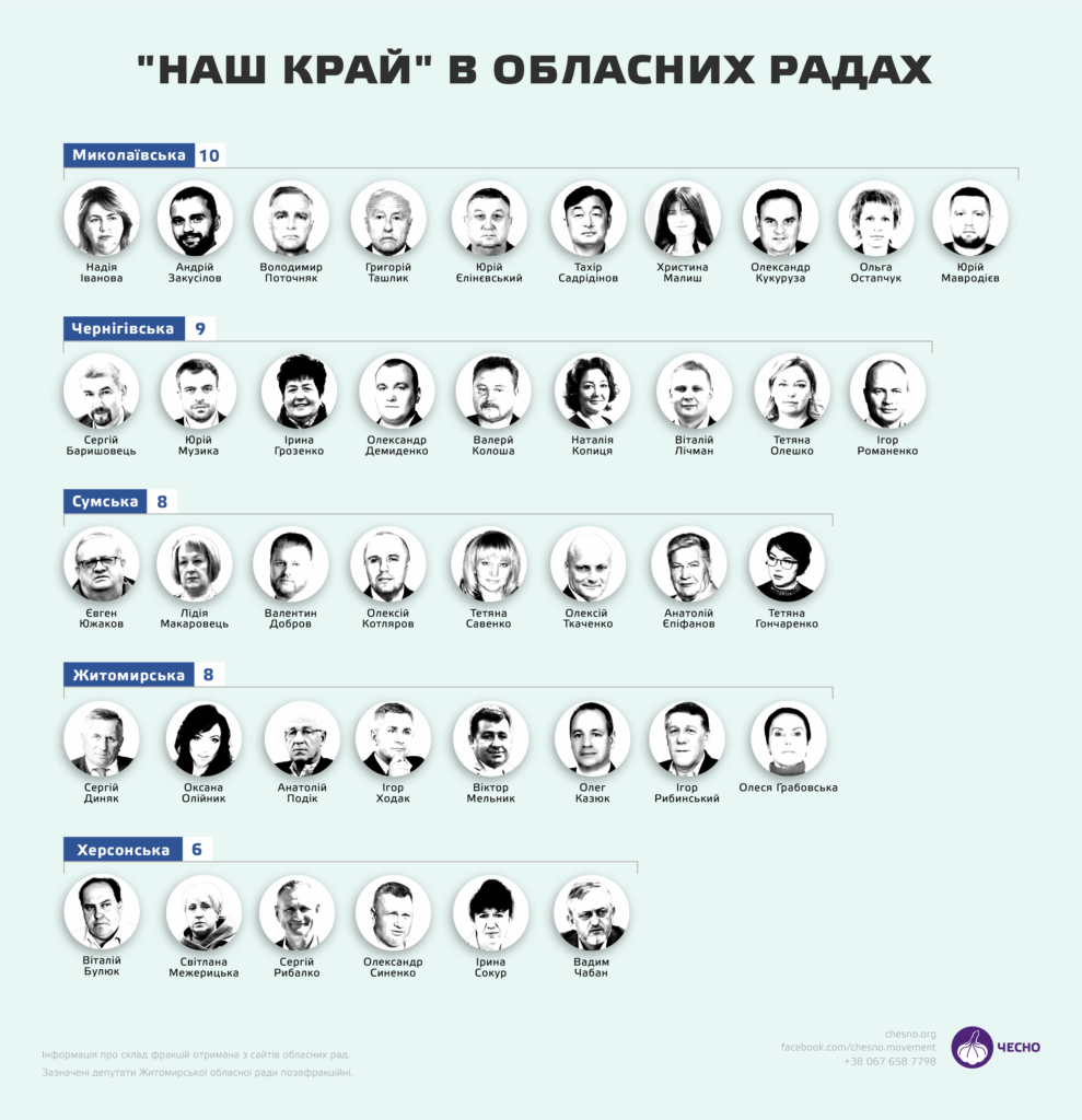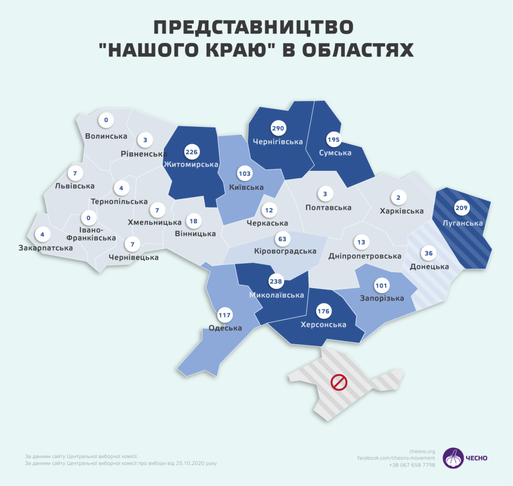 Найвищий рівень підтримки був у “Нашого краю” в Житомирській, Луганській, Миколаївській, Сумській, Херсонській і Чернігівській областях. Приміром, в останній партійці отримали 290 мандатів.